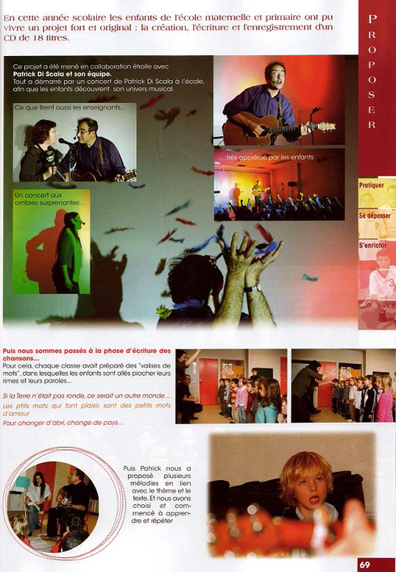 Durant plusieurs jours, Patrick parcourt les classes avec sa guitare. Pour préparer sa venue, l'équipe enseignante à choisi un thème, puis dispatché les sous-thèmes entre les classes. Les enfants ont déja écrit un panier de mots bien rempli de tout ce qui est passé dans leur tête. C'est là que tout commence...